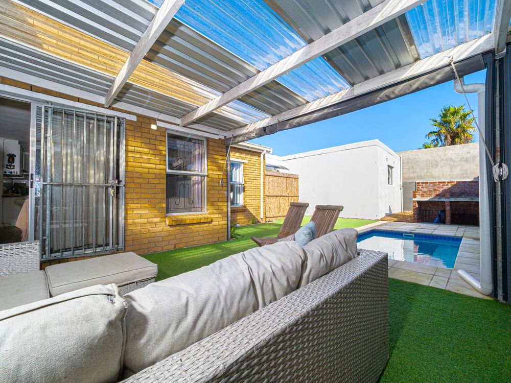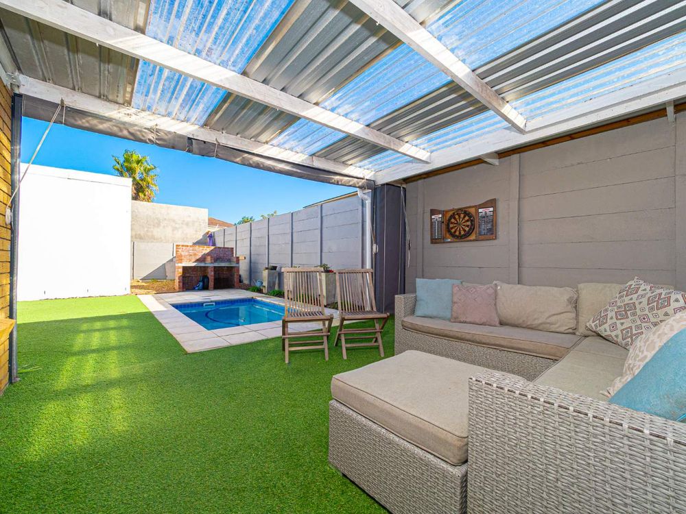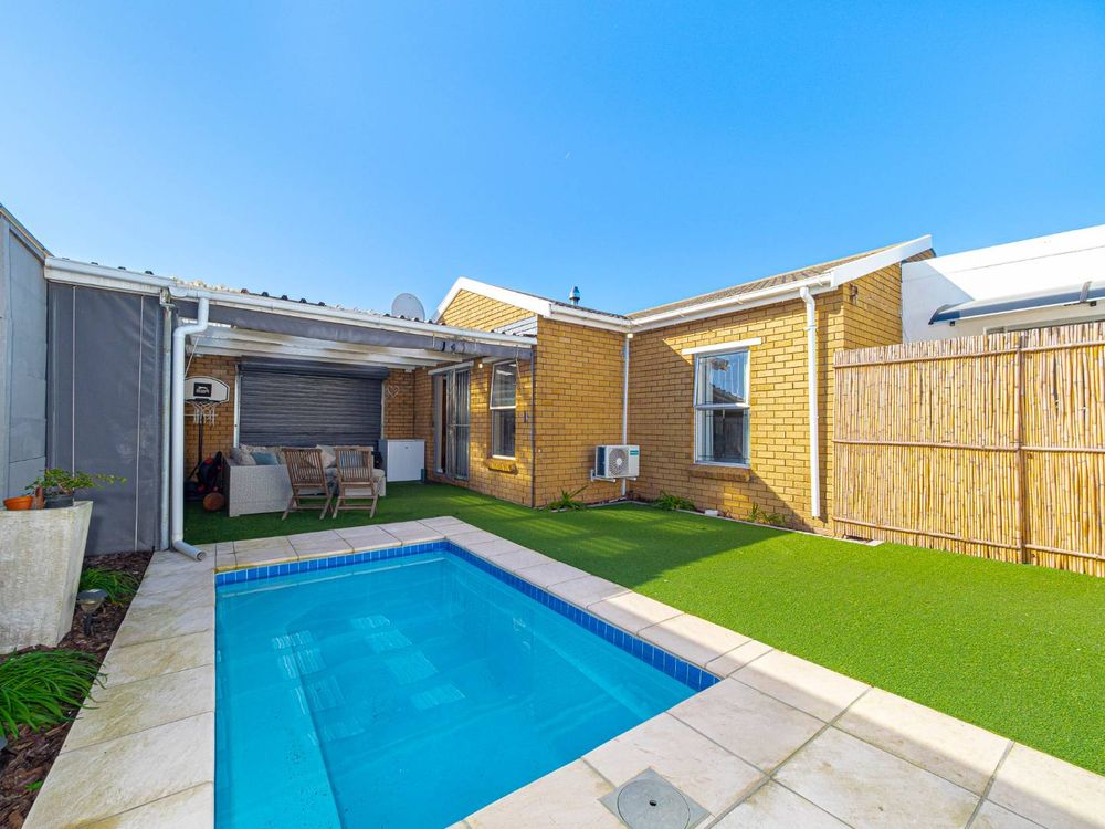 A sliding door leads to a sunny entertainment area featuring an astroturf braai area and a heated splash pool.