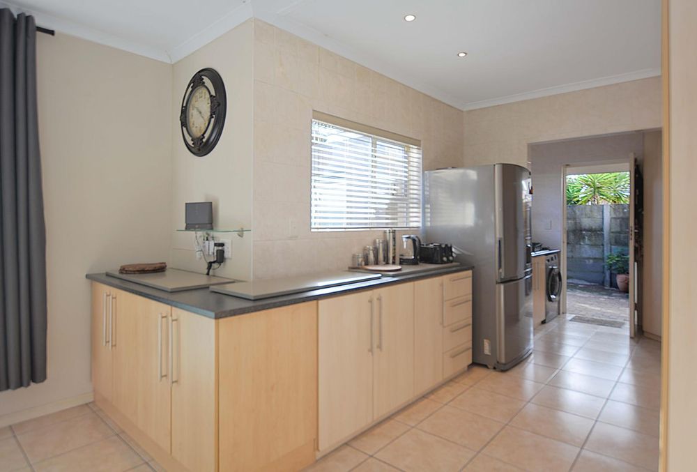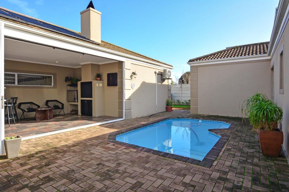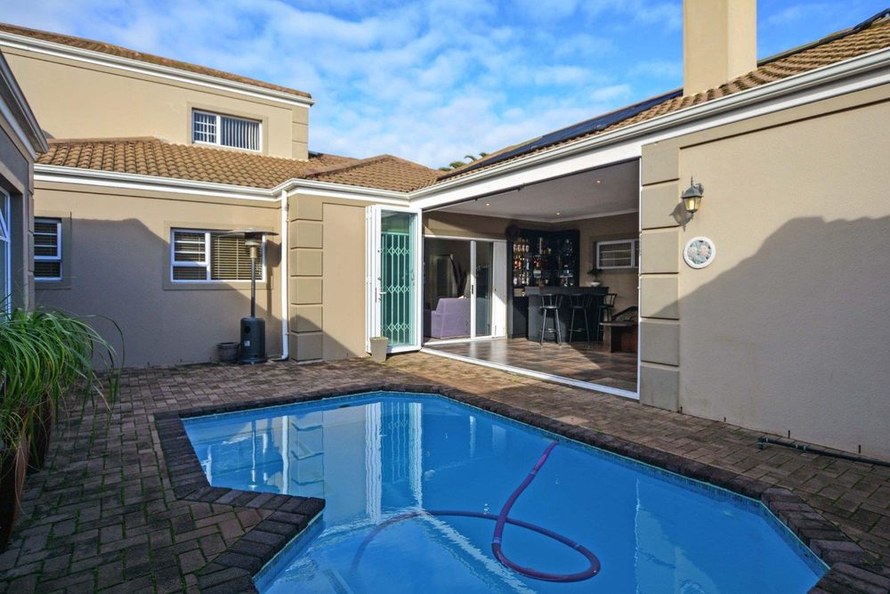 This exceptional corner-lot property is a modern gem with impressive potential for passive income. It features a spacious family residence and two versatile flatlets, offering both contemporary living and income-generating opportunities. The main house boasts an open-plan layout, seamlessly integrating the lounge and dining areas with an enclosed braai and entertainment space, complete with a stylish corner bar. Stack doors open onto a paved pool area with rooftop heating, while the kitchen impresses with ample built-in cupboards, extensive countertops, and a convenient scullery. The residence includes three generously sized bedrooms with built-in wardrobes, a main bedroom with air conditioning and a full ensuite bathroom featuring a corner bathtub. A fully tiled family bathroom with a shower, bathtub, toilet, and vanity unit adds to the home's functionality. The property also offers secure parking with a double and single garage, both equipped with automated doors.