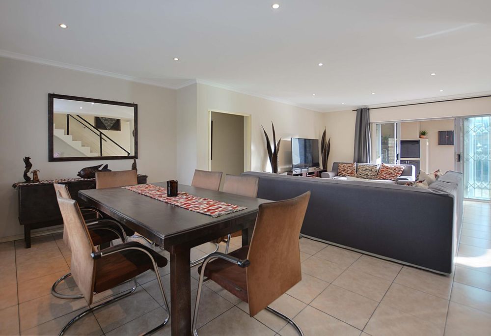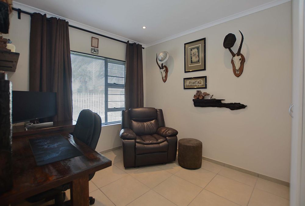 Above the triple garage, the first flatlet provides a private retreat with a bathroom, combined living and bedroom area, and an adjoining gym or workspace—ideal for guest accommodation or a home office. The second flatlet is a well-appointed unit featuring an air-conditioned bedroom with built-in cupboards, an integrated bathroom, and an open-plan kitchen and lounge. Additional amenities include a storeroom, an 8 KW solar system, burglar bars, a safety gate, and an electric fence, ensuring security and sustainability. The back garden is thoughtfully designed with irrigation systems, play areas for children and pets, and dual JoJo tanks for water storage, enhancing the property’s appeal and adaptability for various needs and aspirations.