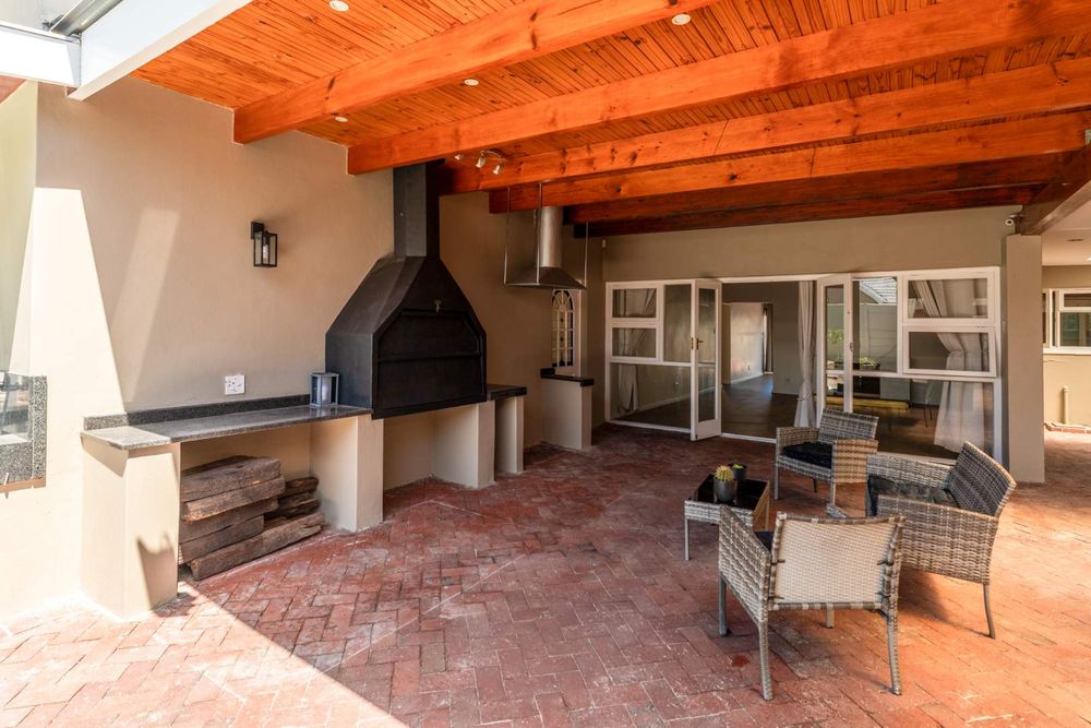 The inviting lounge is fitted with a gas fireplace and opens via patio doors to the sparkling swimming pool and braai area, perfect for entertaining. The modern kitchen includes ample built-in cupboards, sleek Caesarstone countertops, and a central island, flowing seamlessly into the open-plan dining room. A separate scullery completes this space.