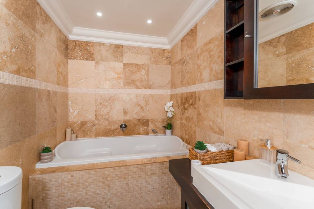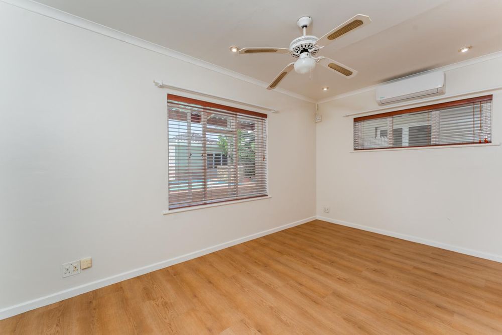 The main house features vinyl flooring throughout and comprises three spacious bedrooms, all with built-in cupboards. The main bedroom boasts a walk-in closet and a full en-suite bathroom with a bath. A family bathroom offers both a bath and shower, with a separate toilet for added convenience.