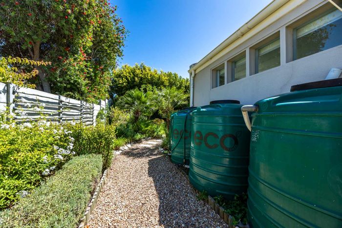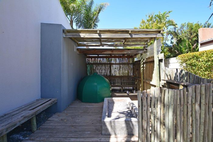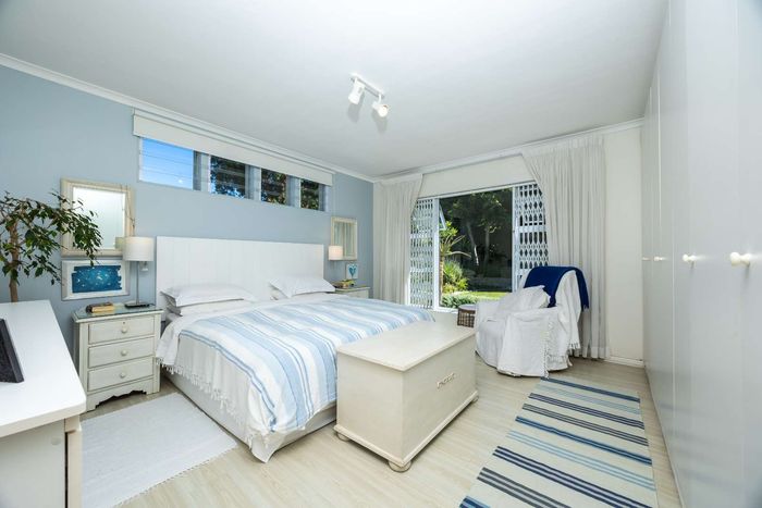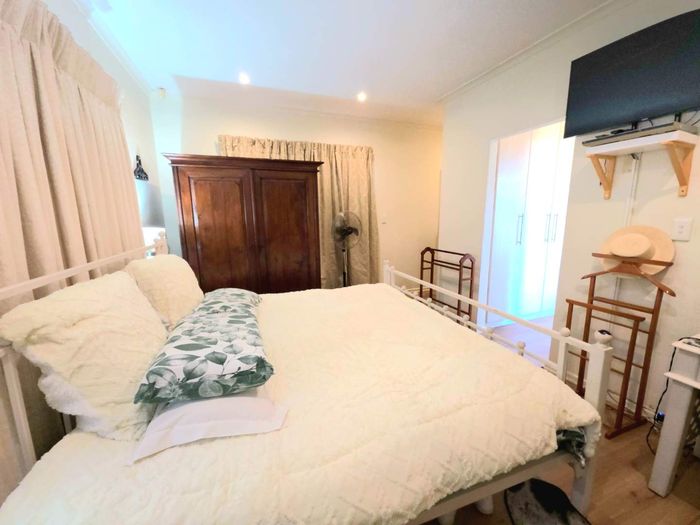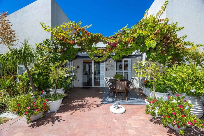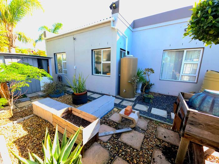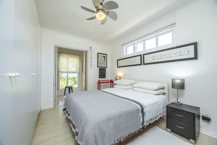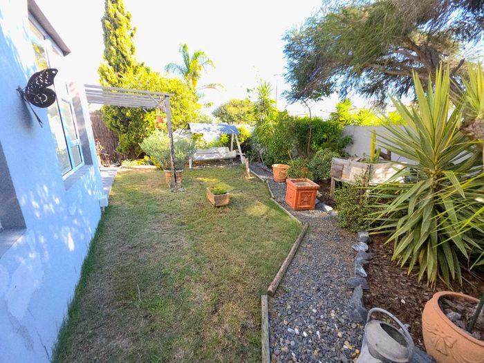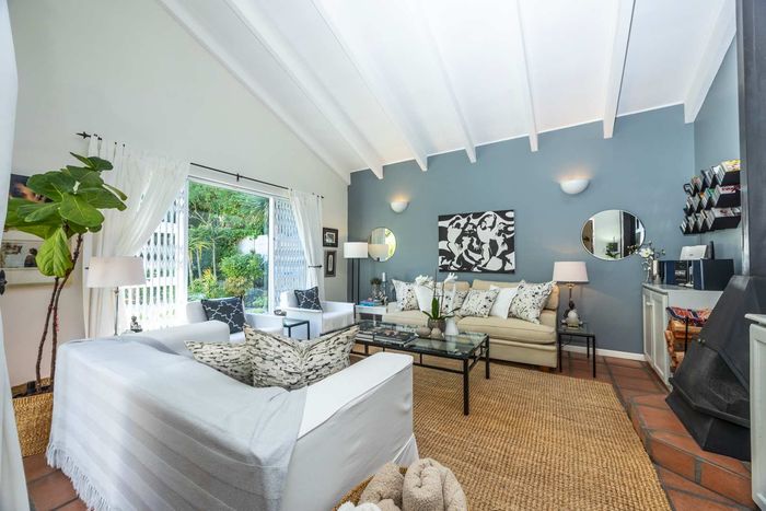 Relaxed coastal living in Blouberg Sands, minutes from the beach, with a lush private garden and pool, open-plan living with fireplace — two beds, two baths, double garage.