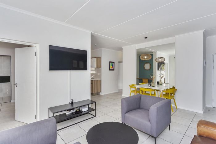 Relaxed lock-up-and-go living with Table Mountain sunsets in Burgundy Estate, close to Century City and beaches, light-filled open plan with outdoor braai; two bedrooms, one bath.