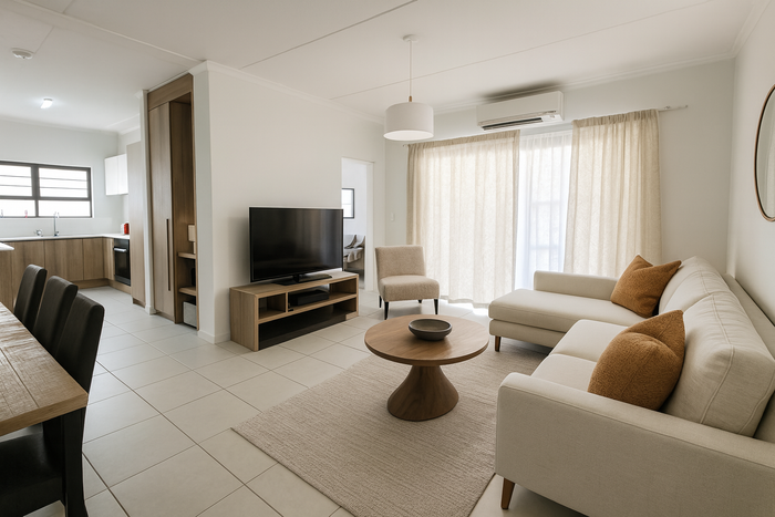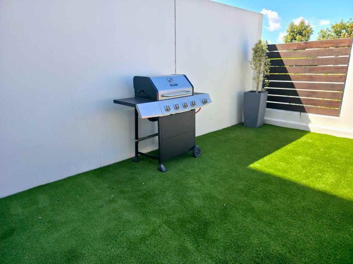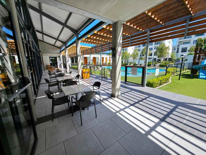 Alfresco entertaining and relaxed suburban living in Burgundy Estate — modern open-plan apartment with a balcony and built-in braai, communal pool access, two bedrooms and two bathrooms.