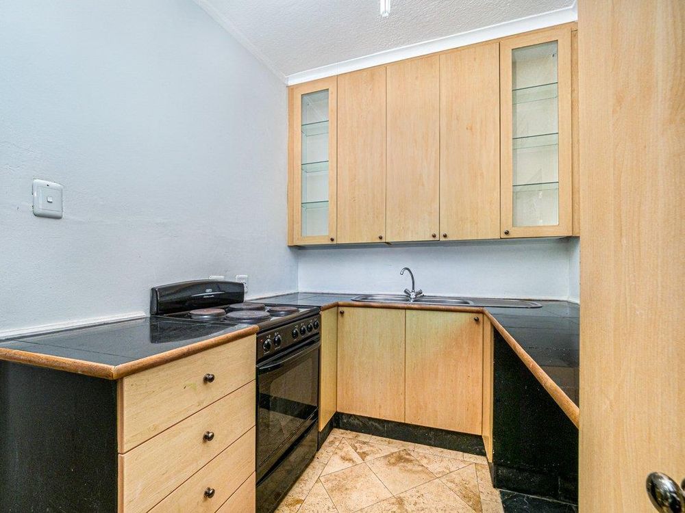 With easy access to the apartment with only a few steps inside one can either enter through the patio or front door. The lounge and bedroom have parquet flooring. The kitchen features travertine tiles, solid countertops, ample cabinet space, and space for 2 under-counter appliances and a fridge. The Lounge leads to the patio. This apartment has a generous sized bedroom with a free-standing wardrobe and will fit a King size bed with ease, offering comfort and privacy. The bathroom has travertine tiles with a shower over the bath.