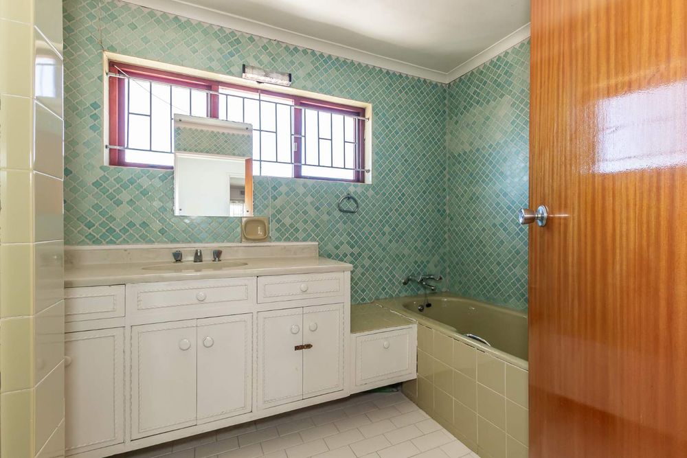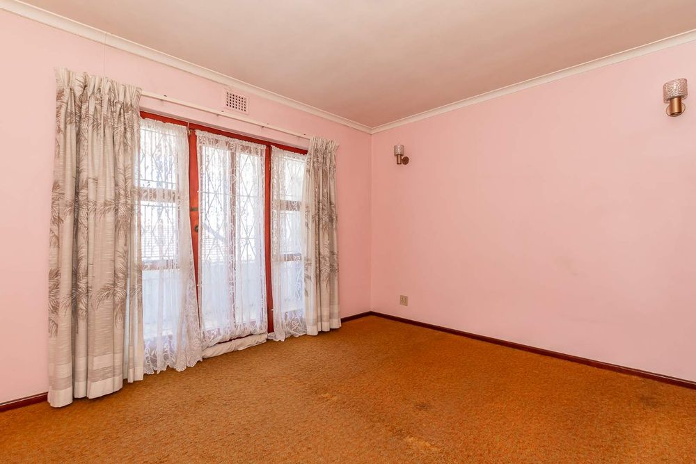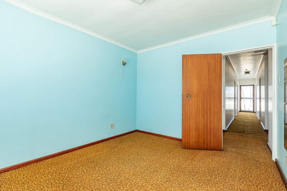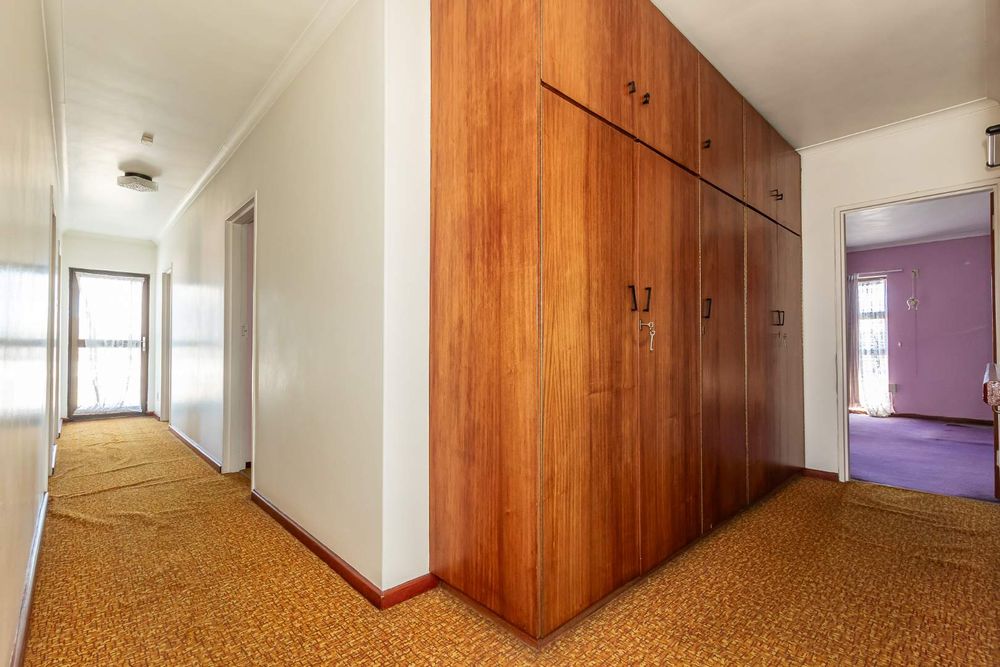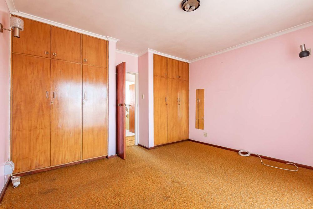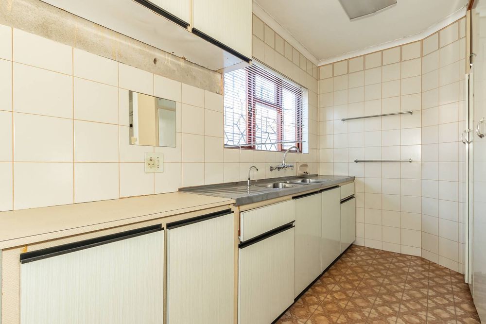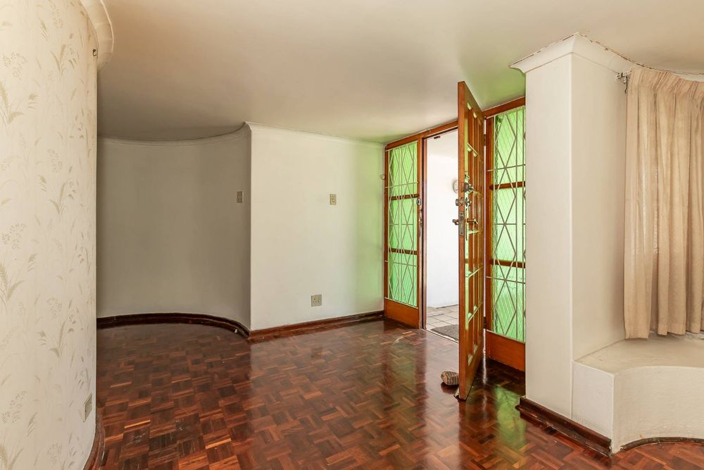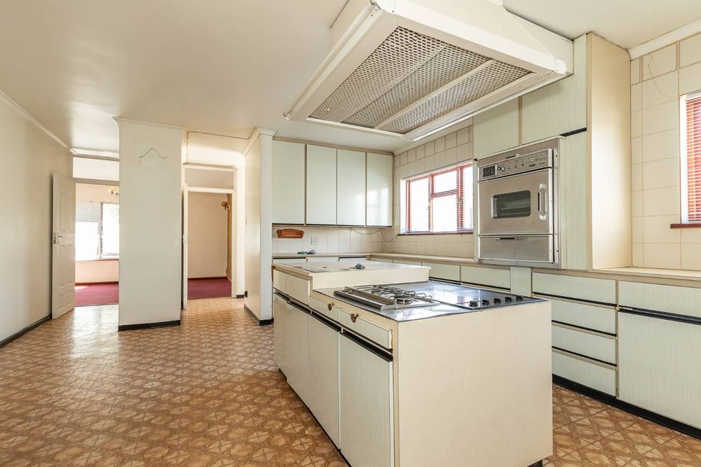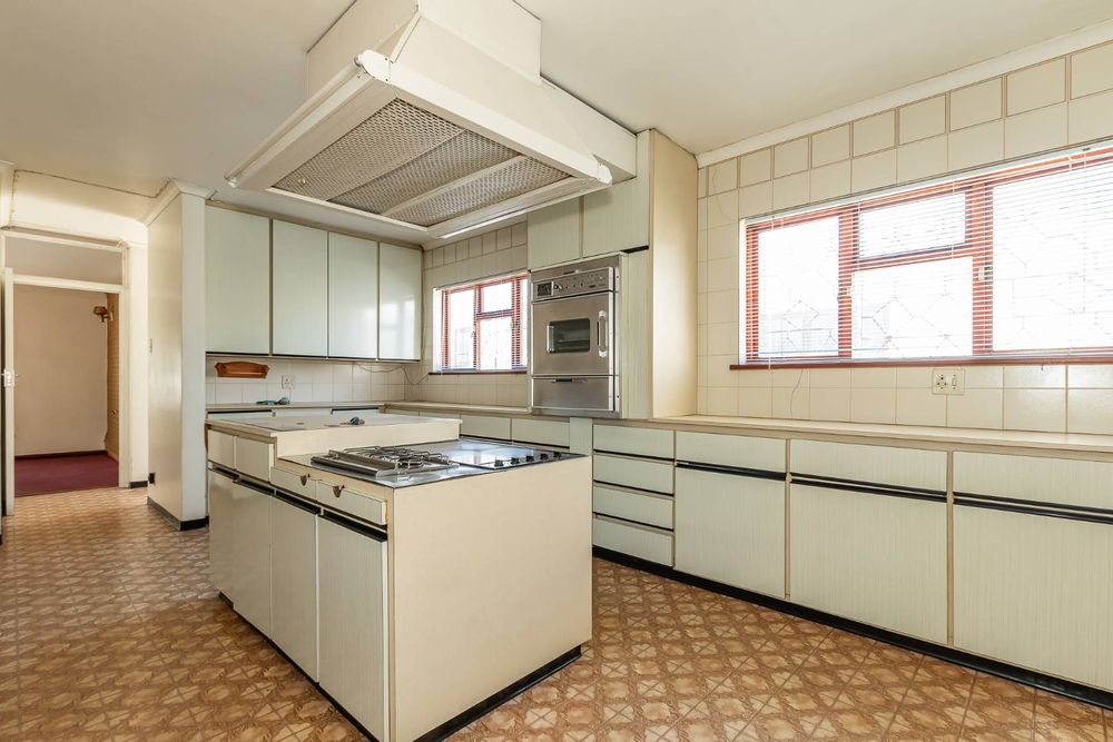 The front yard is completely brick-paved, with automated gates leading into a garage. Adjacent to the garage are a few steps that lead you to the front door and the double-volume entrance hall. The fully tiled lounge is very large and can easily accommodate as many as 20 guests. There is a separate dining room with parquet flooring. The gourmet kitchen is tiled, with a fitted stove in a central island setting and a wall-mounted double oven. There are cupboards all around. There is also a scullery with connection points for a washing machine and a dryer.