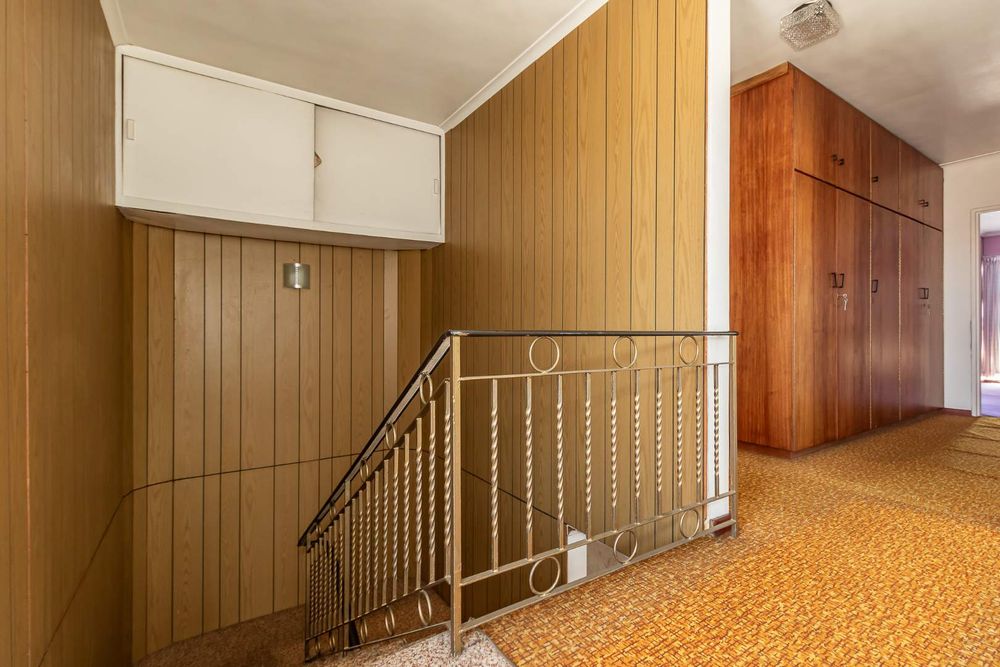 A double-landing staircase leads to five massive, carpeted bedrooms upstairs, all of which have cupboards. The main bedroom has a fully tiled ensuite, consisting of a shower, basin, and toilet. There is also a family bathroom with a bath, shower, basin, and toilet. In addition, there is a third toilet and basin. Two bedrooms open through sliding doors onto a wrap-around covered balcony with beautiful views of the neighborhood and far beyond.