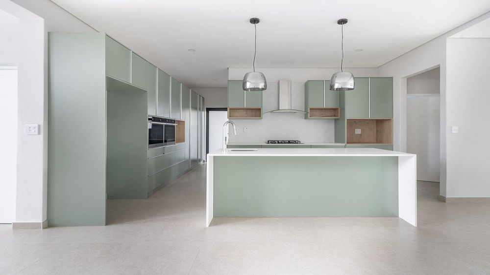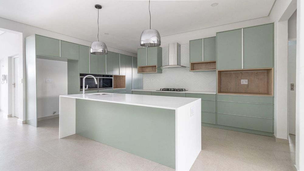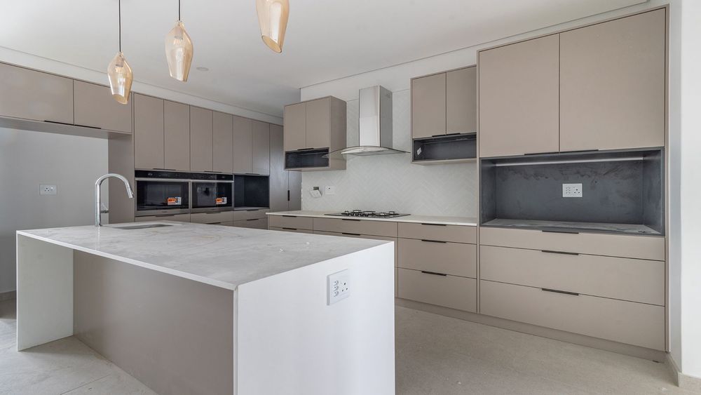 Downstairs, the home opens into a seamless open-plan lounge, dining area, and kitchen, perfect for modern living and entertaining. The stylish kitchen is equipped with two eye-level ovens, a gas stove on the central island, and a dedicated laundry area with plug-in points for a washing machine, dishwasher, and tumble dryer.