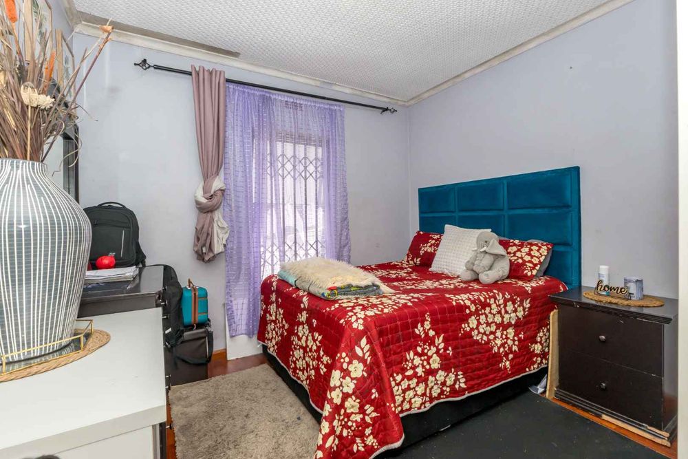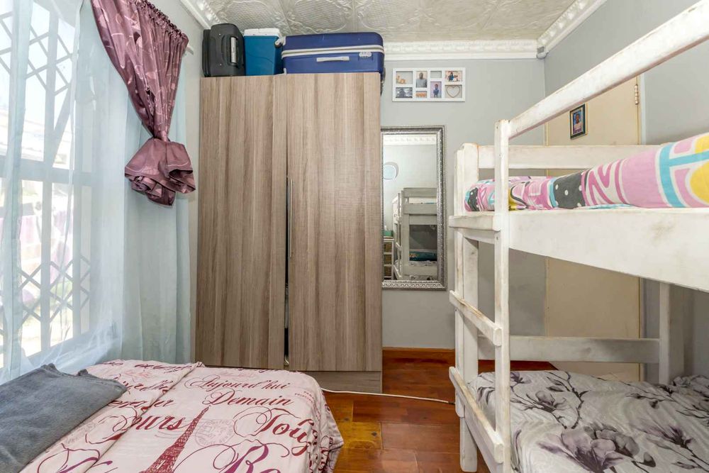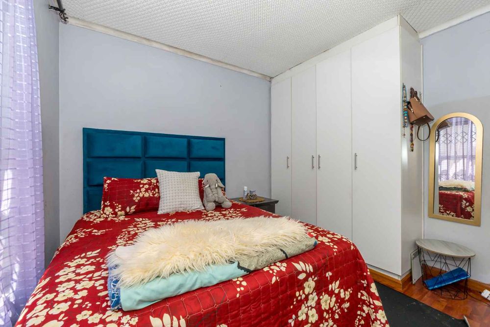 The home offers a tiled lounge, creating a clean and low-maintenance living space, while both bedrooms feature warm laminated flooring that adds comfort and charm. The fully fitted kitchen provides ample cupboard space and practicality for everyday living. Burglar bars throughout the property offer added peace of mind.