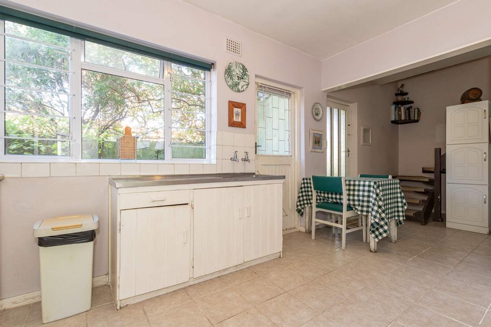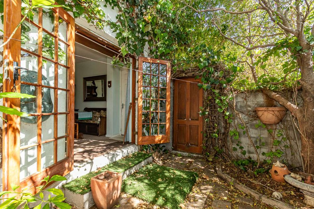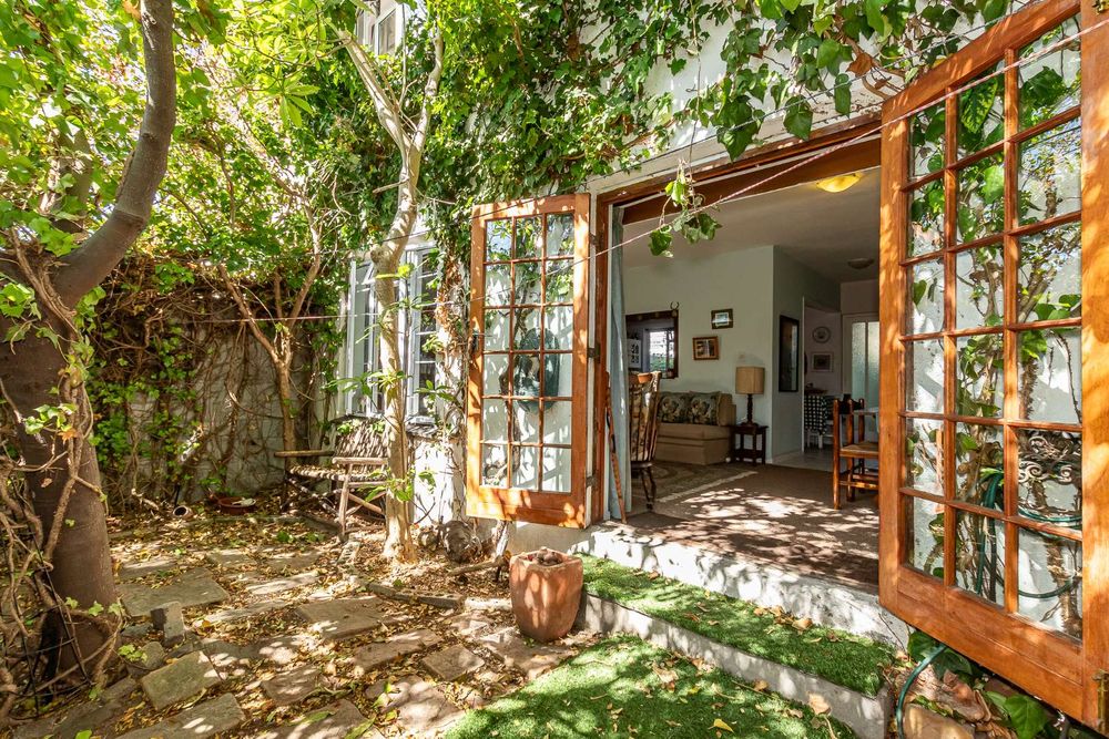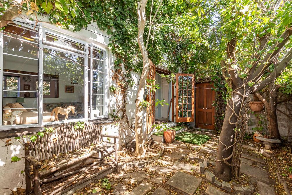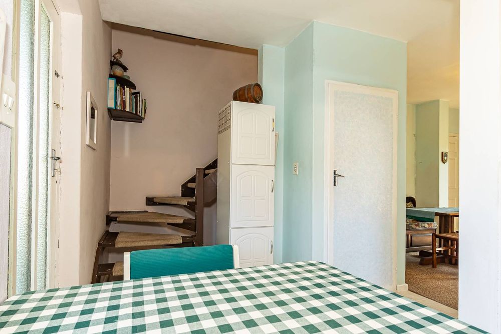 The kitchen is equipped with a 2-plate stove and free-standing cupboards, and it provides direct access to a sizeable, private back courtyard. For added convenience, a separate guest loo is located under the staircase.