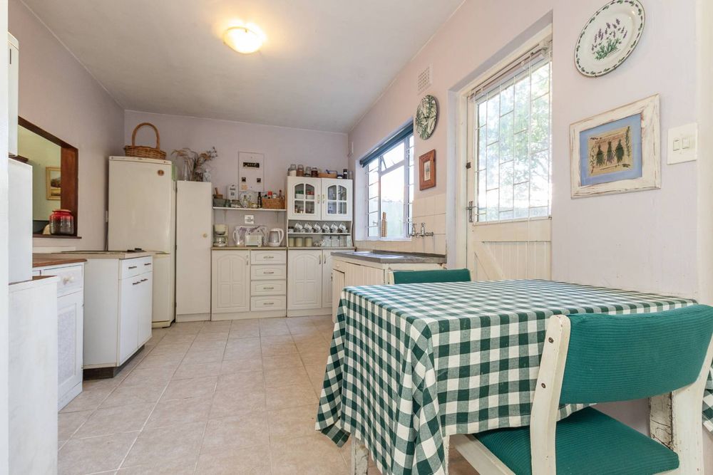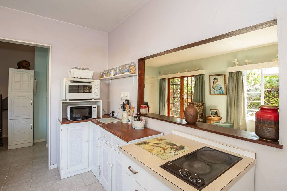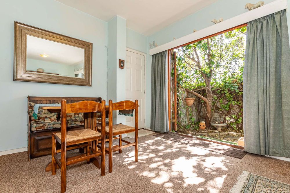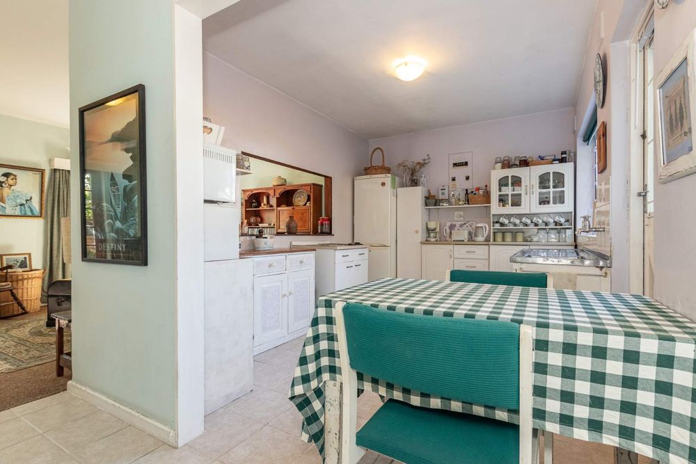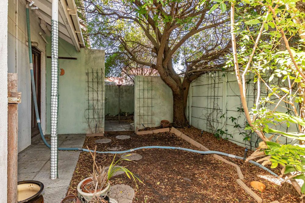 The kitchen is equipped with a 2-plate stove and free-standing cupboards, and it provides direct access to a sizeable, private back courtyard. For added convenience, a separate guest loo is located under the staircase.