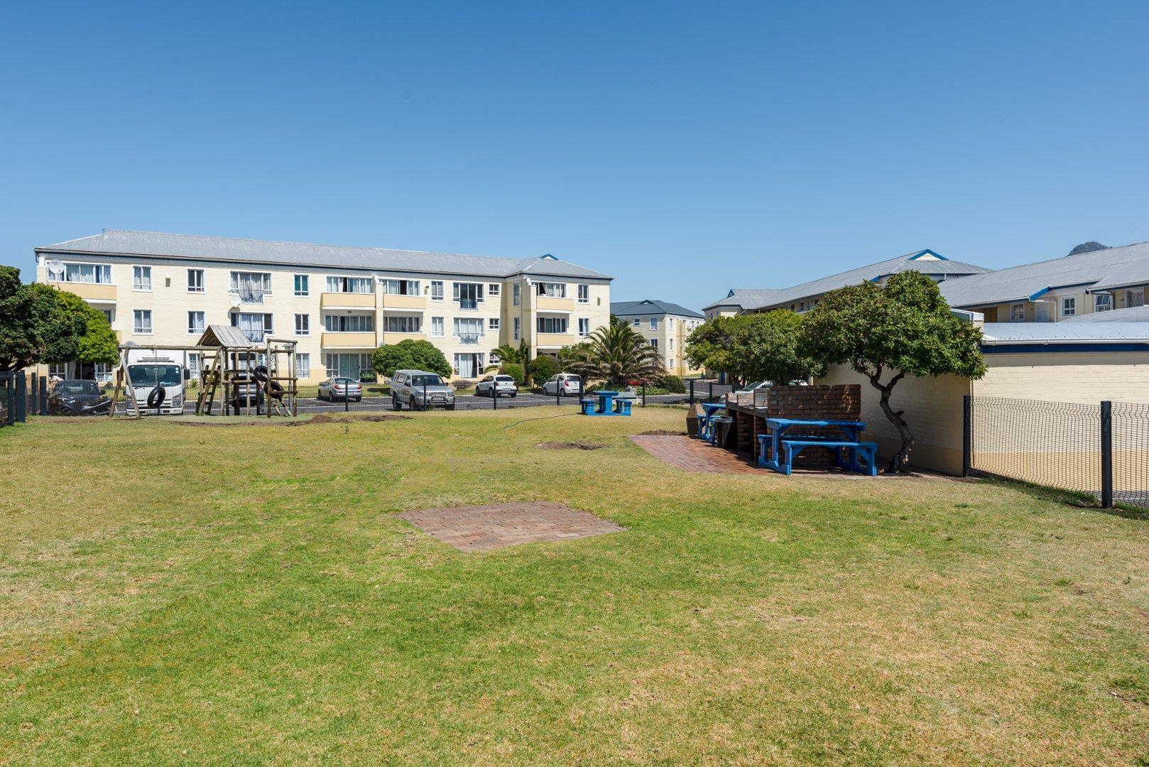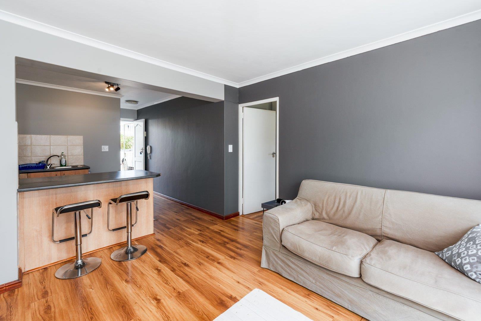 Open plan lounge/dining and kitchen. The living area has a sliding door that opens to the communal grounds.