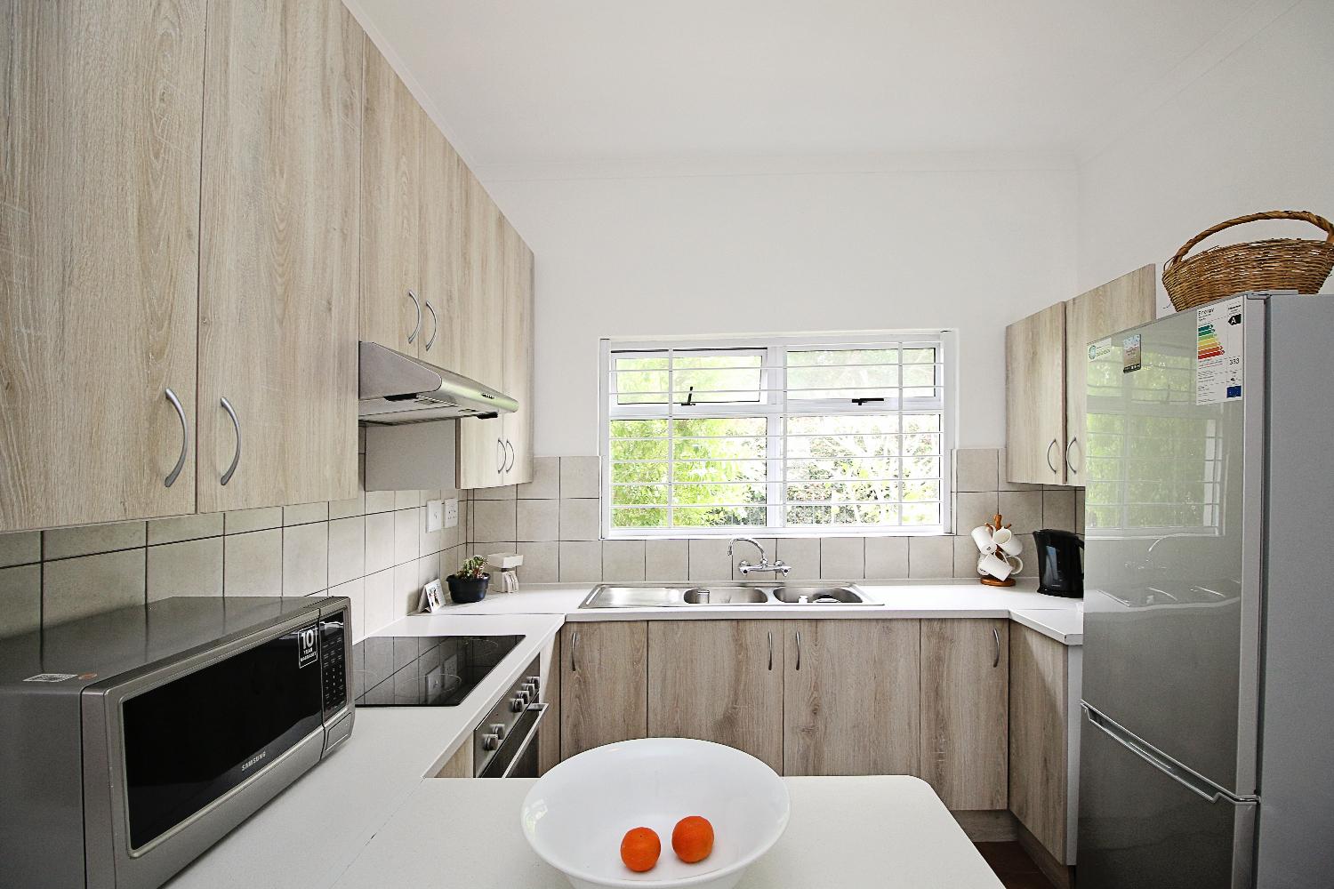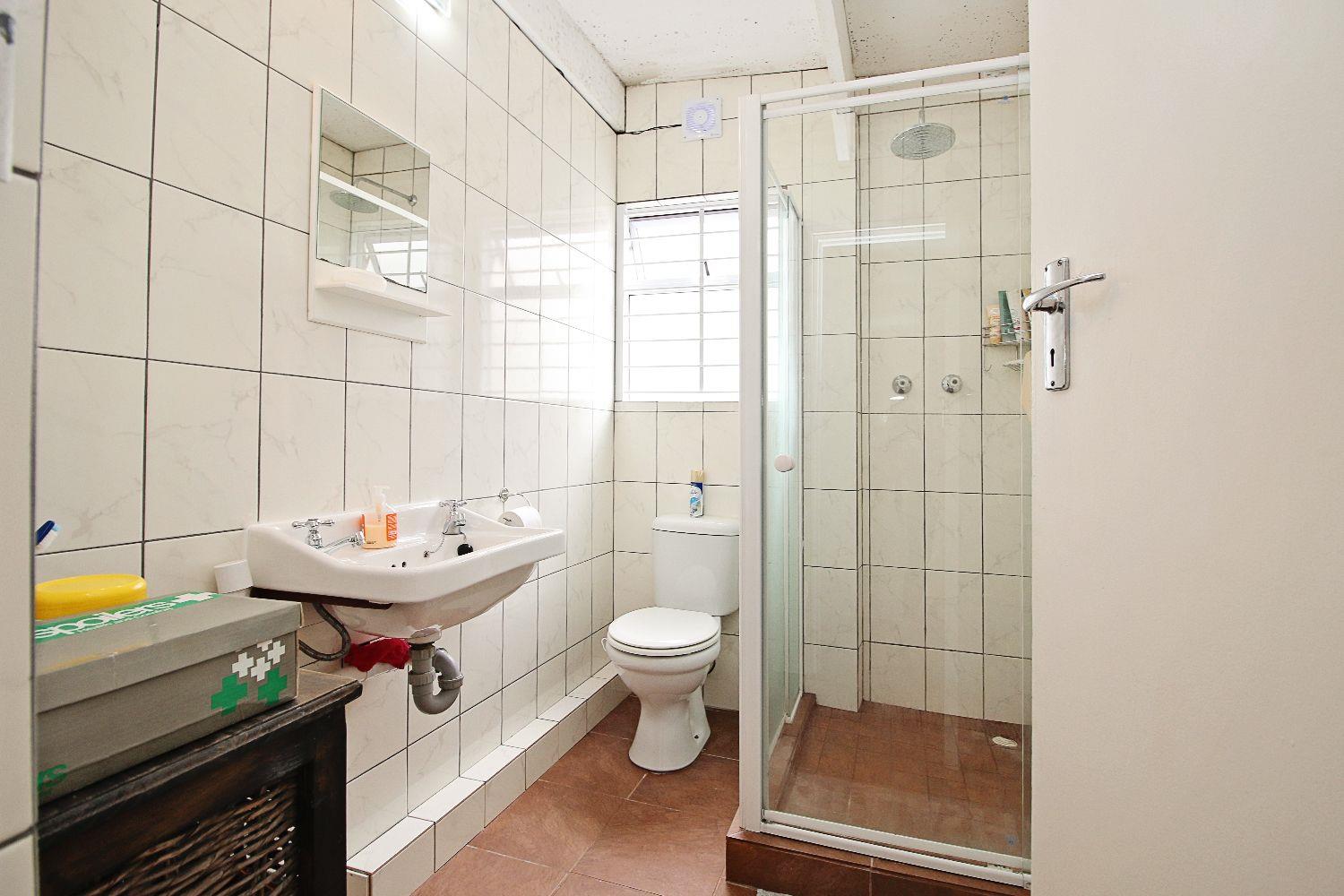 The cottage includes a guest bathroom with a toilet, wash hand basin, and bath, as well as a family bathroom featuring a shower, toilet, and wash hand basin for added convenience. Security is a priority with burglar bars and security gates installed, ensuring peace of mind.