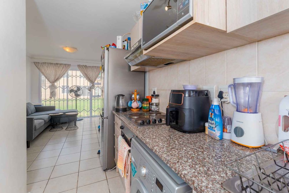 Inside, the unit features a functional yet comfortable layout. A dedicated lounge and dining room provide distinct spaces for relaxation and entertaining. The galley‐style kitchen is fitted with modern stainless steel appliances including refrigerator, integrated washing machine, stove, hob, and oven with ample cabinetry for storage. Natural light and tiled flooring enhance the practicality of this space.