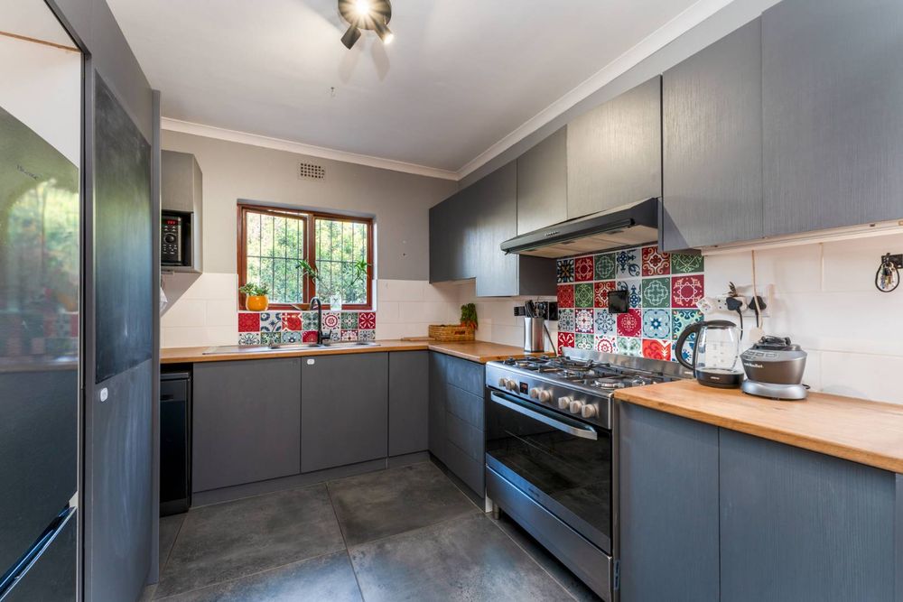 The kitchen is modern with ample space, 5-plate gas stove, plenty of cupboard space and plumbing for dishwasher and washing machine, double sinks.
