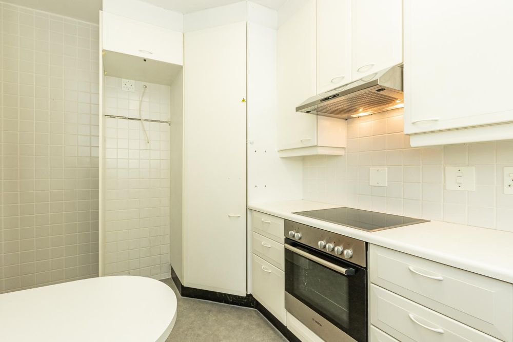 The kitchen has everything you need, including a pantry cupboard, making it functional, with a small table also providing useful space. Opposite the kitchen, there is a convenient closet cupboard for your utilities. The bedroom continues the element of brightness and spaciousness, leading onto the garden with its own space to sit and enjoy. All rooms have curtains, adding warmth to the apartment. Full bathroom.