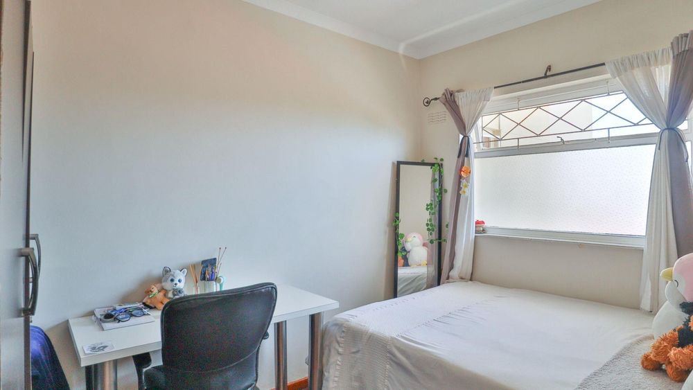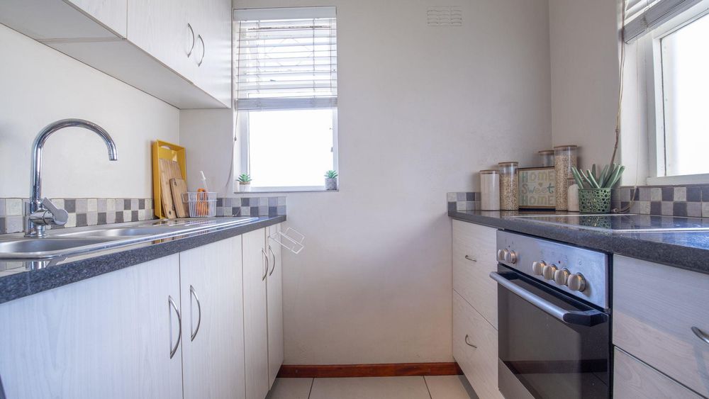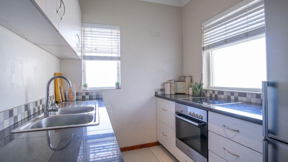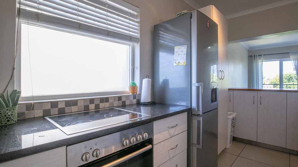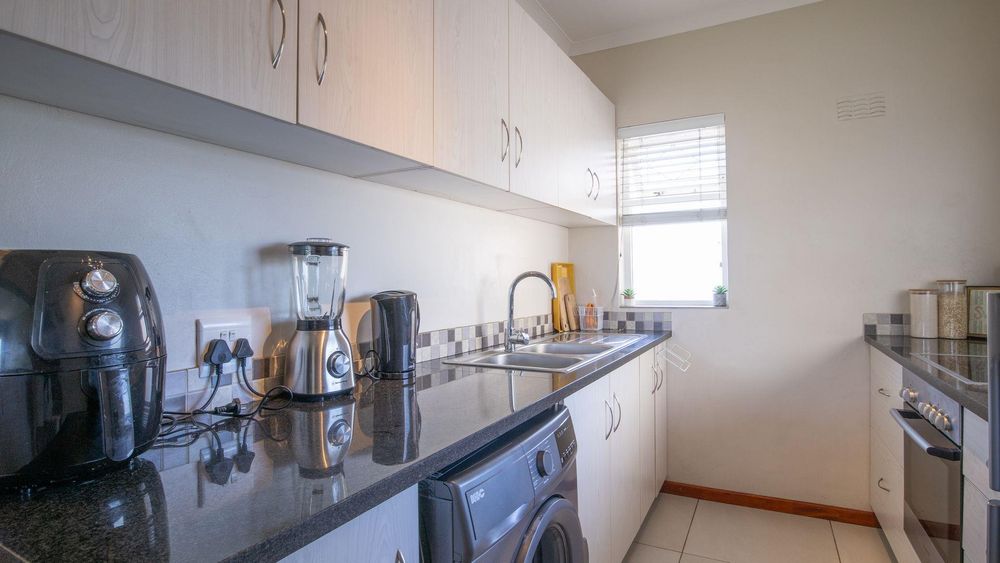 The lounge/diningroom with solid, parquet wooden floors leads out to a balcony and is semi open-plan to the modern and functional kitchen with granite tops and fitted blinds, loads of built-in cupboards, an electric oven and hob, plumbing for washing machine/dishwasher plus a breakfast counter.