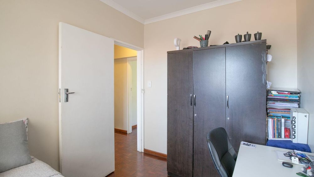 The second bedroom has a freestanding cupboard and parquet floors.